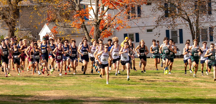 As much as the girls race showcased a dominant team, the boys race was a seesaw battle not decided until the final moments. NH#2 defending champs Hanover were the slim favorites over last year’s runner ups, a new young NH#3 Coe-Brown team. Hanover had the potential to have two low sticks as Ben Groves was favored to win while his teammate Isaac McNaughton could be his largest competition. The Black Bears have been running as a pack the entire season featured by a 19 second 5 man gap at MI50 earlier in the season. So yes, this had the makings of a classic, and it did not disappoint.
