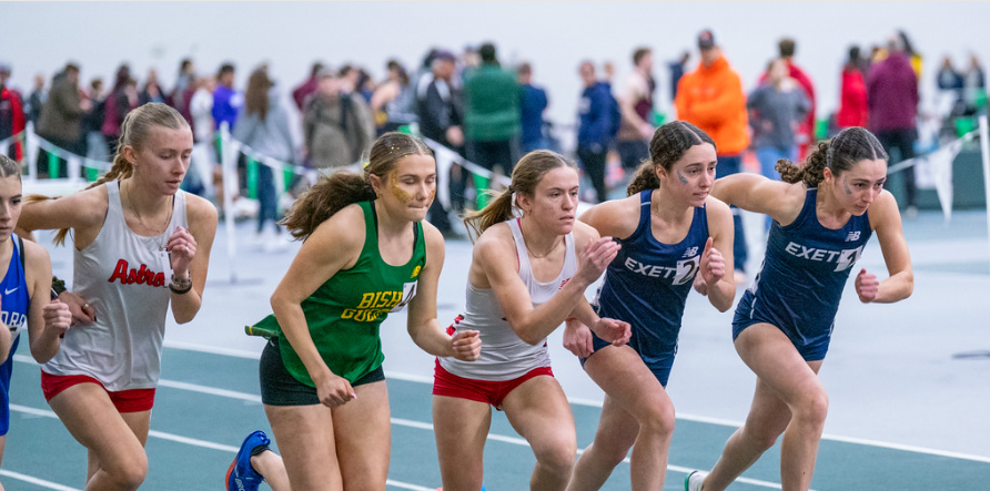 3000 Meters: The meet started with the 3000m, and neither race disappointed. On the girls’ side, the dynamic twin duo of Alexis and Brianna Paterna (Exeter) finished 1-2 to secure valuable team points. Brianna was able to hold off a tough Gabrielle Bedard (Pinkerton) on the final lap. All three could do damage in the 2-mile at New Englands. Rounding out the scoring were Zoe Coler (BG), Lyla Masson (BG), and Sofia Parisi (Winnacunnet).
