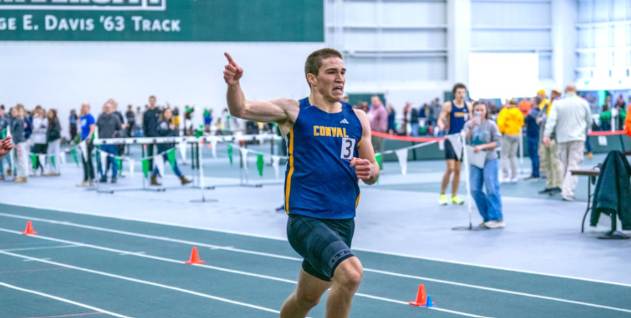 The 1500 was also pivotal. Competing on what may say is his home track, Plymouth senior Tate Hayman, fresh off a nordic ski meet on Saturday, was able to hold off a hard charging pack to take the 1500 title in 4:18.07. How close was this race? Well we had the top 4 cross within a second of each other. Doubling back, from earlier events, both state champs in their own rights, both Joslyn and Lehman made strong final bids trying for their second titles fo the day. To Hayman’s and Coe-Brown’s Ben Larson’s credit, as fresh racers, they kept the pace honest. Larson made a bid of his own with a few laps remaining and then raced Joslyn and Lehman to the line as well. In the end, it would be Joslyn (4:18.39), Larson (4:18.42) and Lehman (4:18.71) placing 2nd-4th. What a race! Along with Sammy Youngs’s 6th place, CBNA picked up another 9 pivotal points.